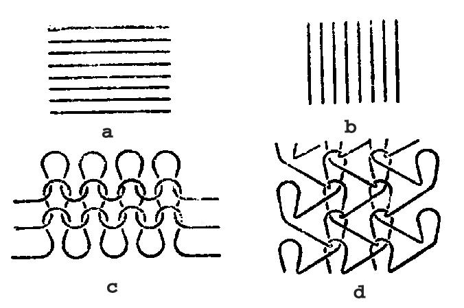 a-橫向紗線編織系統(tǒng) b-縱向紗線編織系統(tǒng) c-橫向紗線的彎曲 d-縱向紗線的彎曲